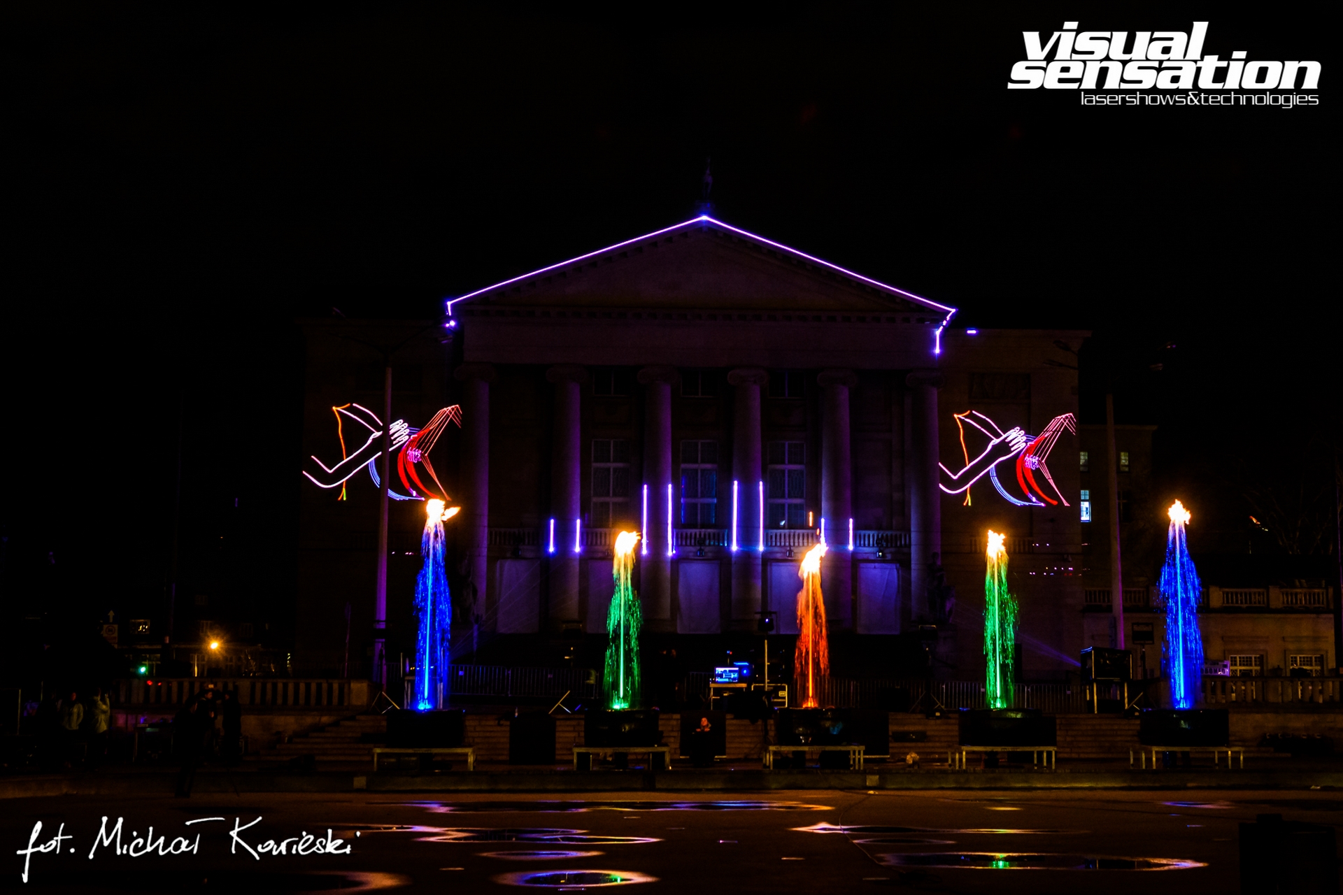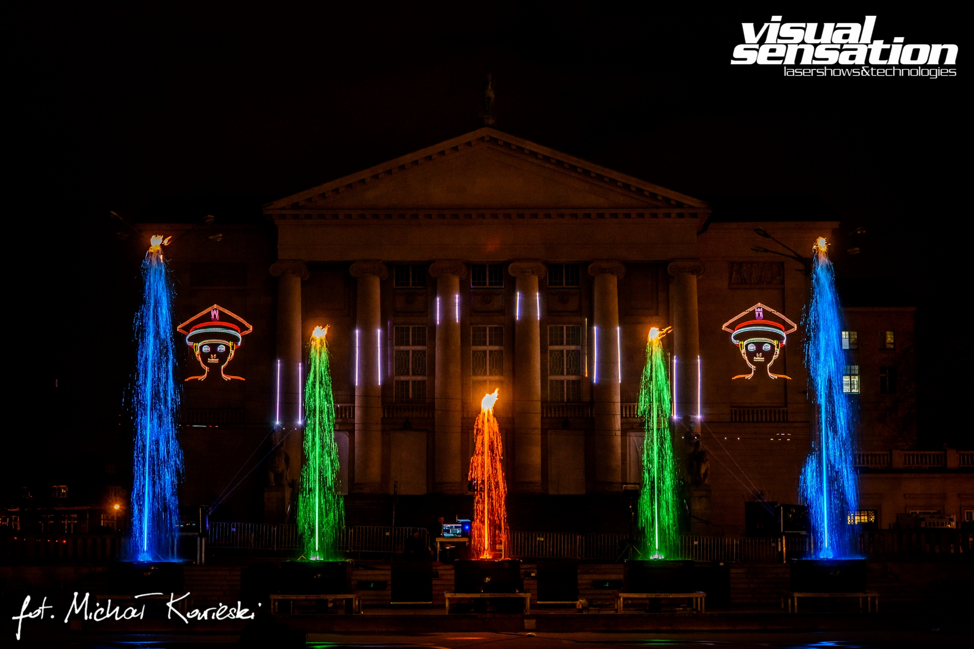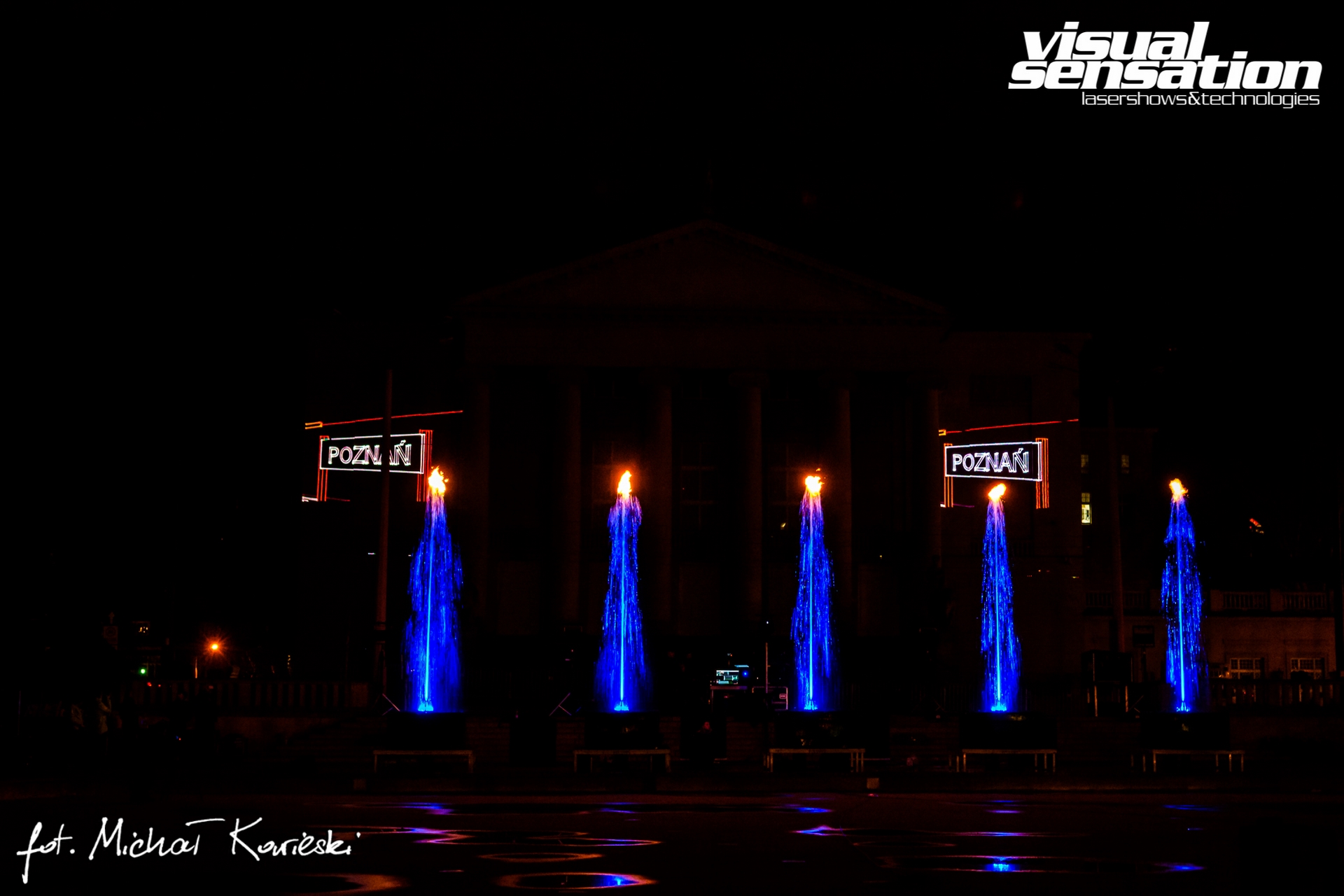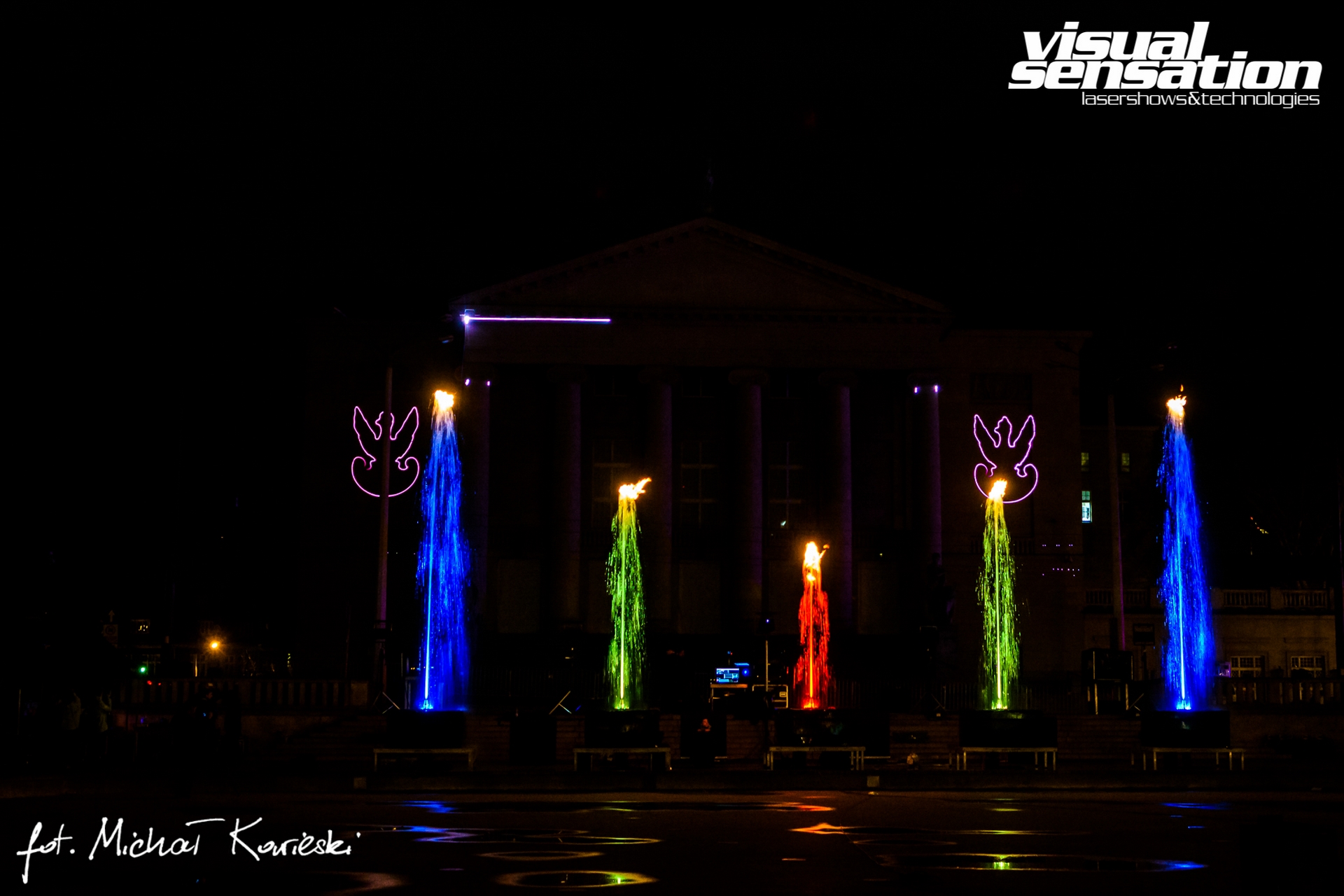 Pokaz laserowy z wykorzystaniem fontann wodnych z płonących żywym ogniem podczas Festival of Lights Poznań – W hołdzie Powstańcom.