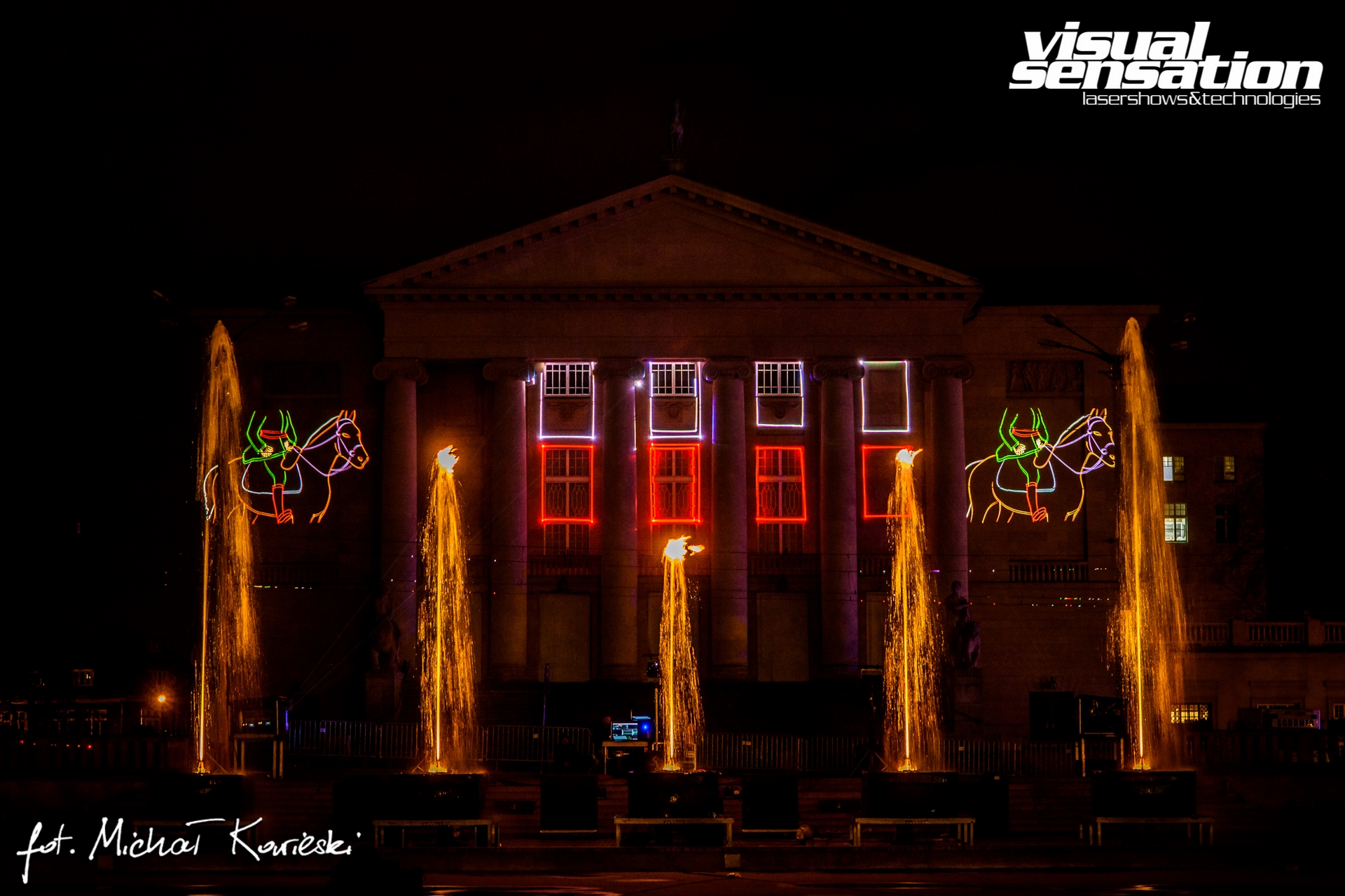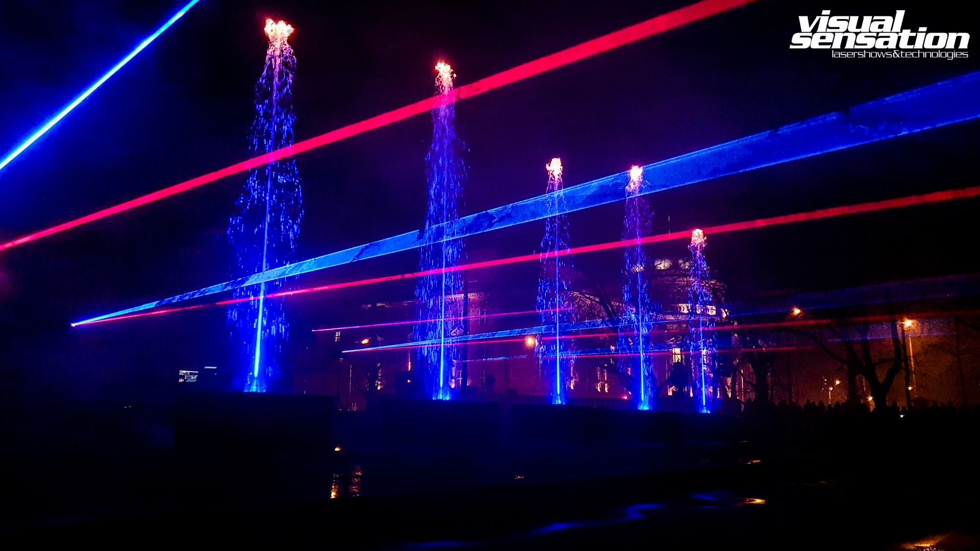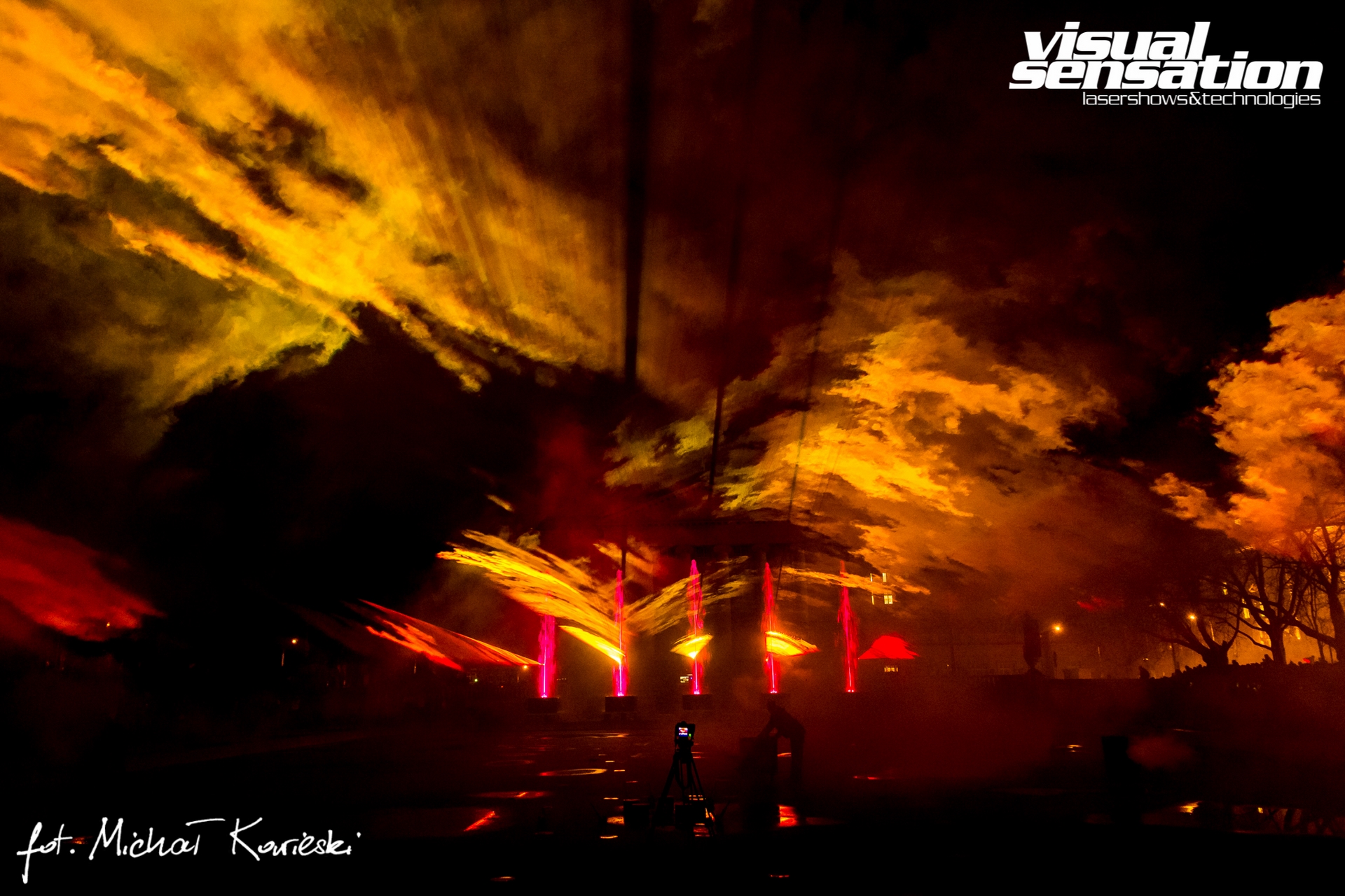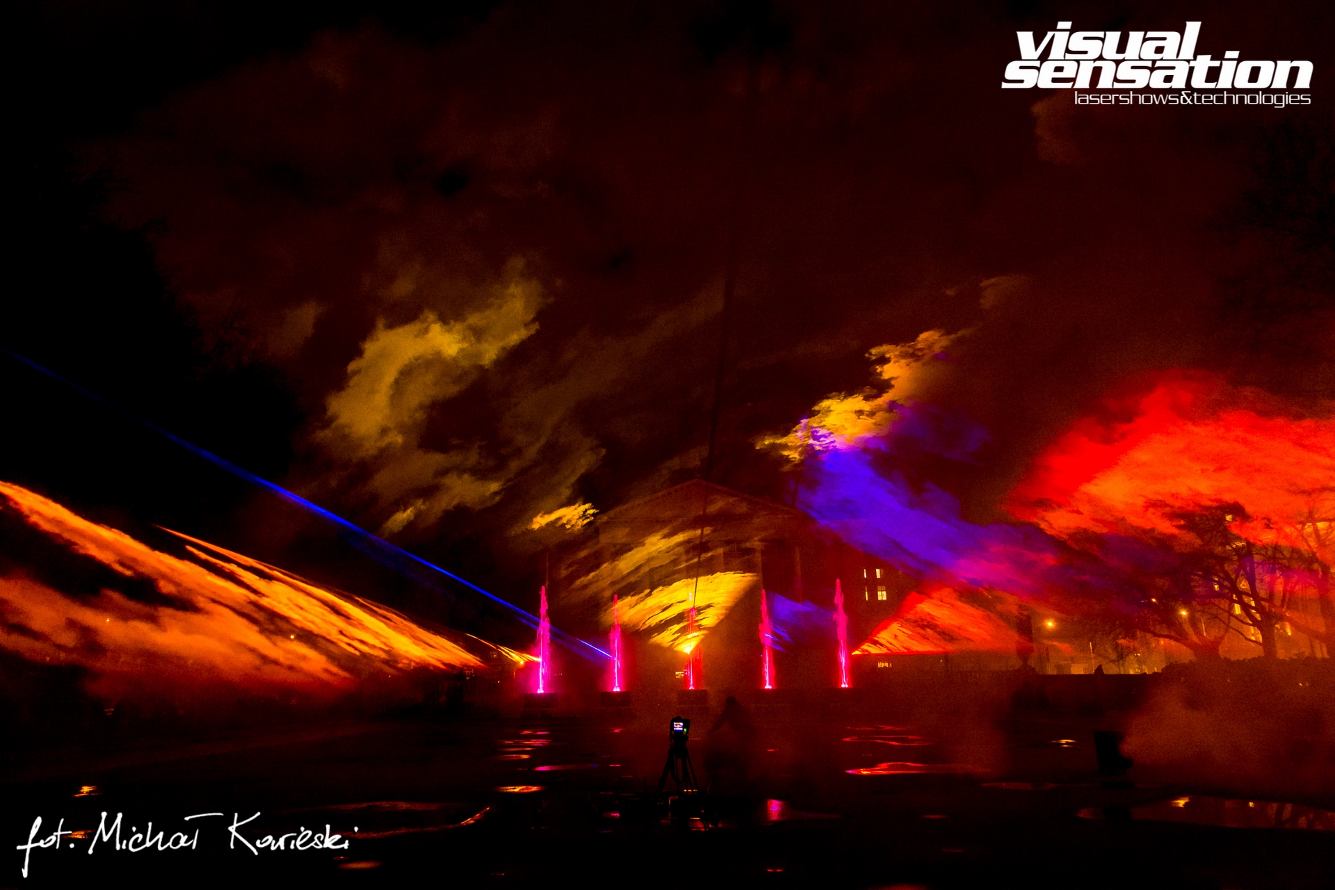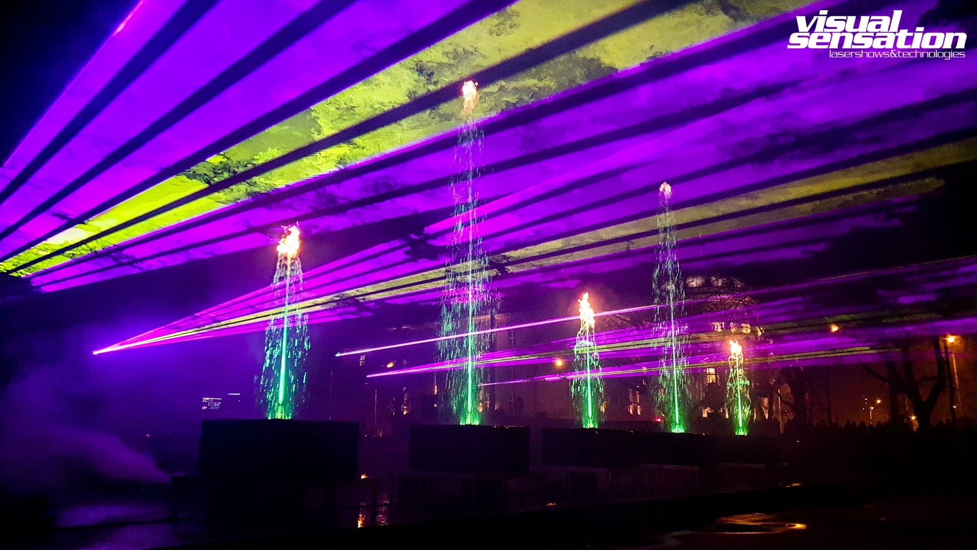 Pokaz laserowy z wykorzystaniem fontann wodnych z płonących żywym ogniem podczas Festival of Lights Poznań – W hołdzie Powstańcom.