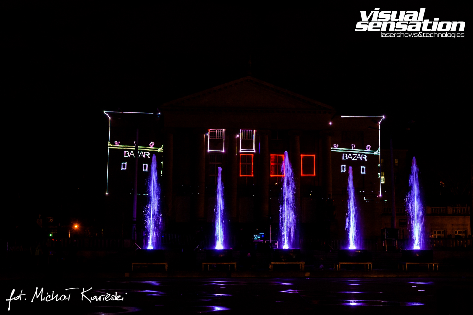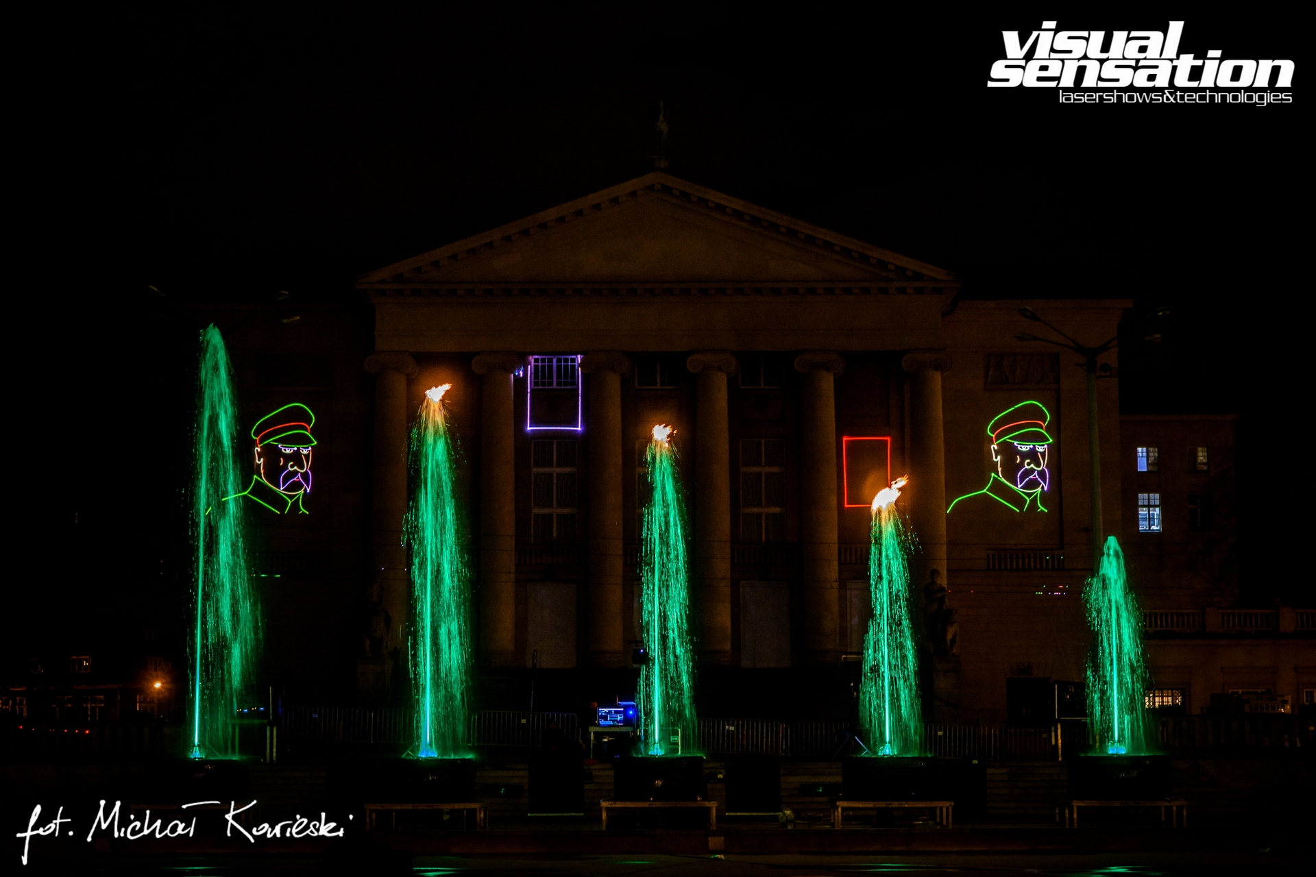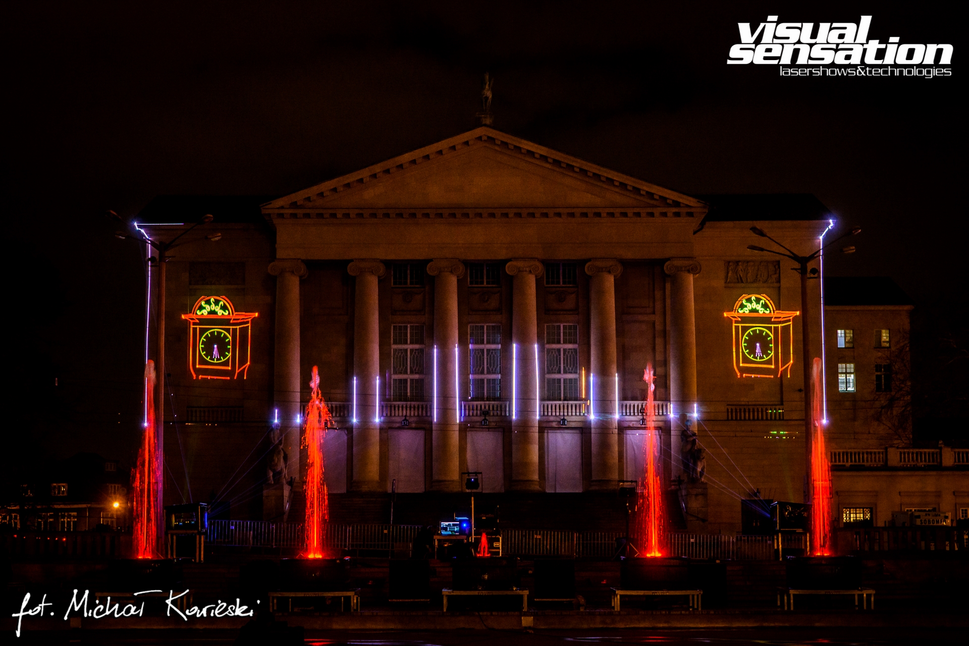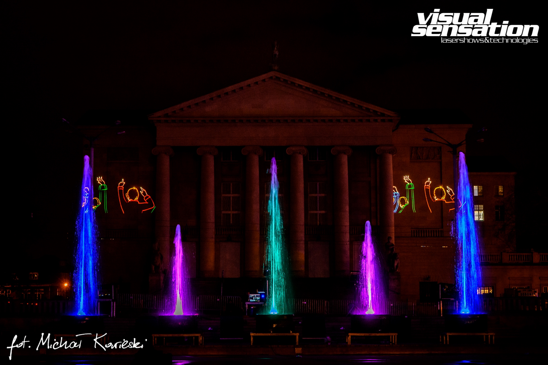 Pokaz laserowy z wykorzystaniem fontann wodnych z płonących żywym ogniem podczas Festival of Lights Poznań – W hołdzie Powstańcom.