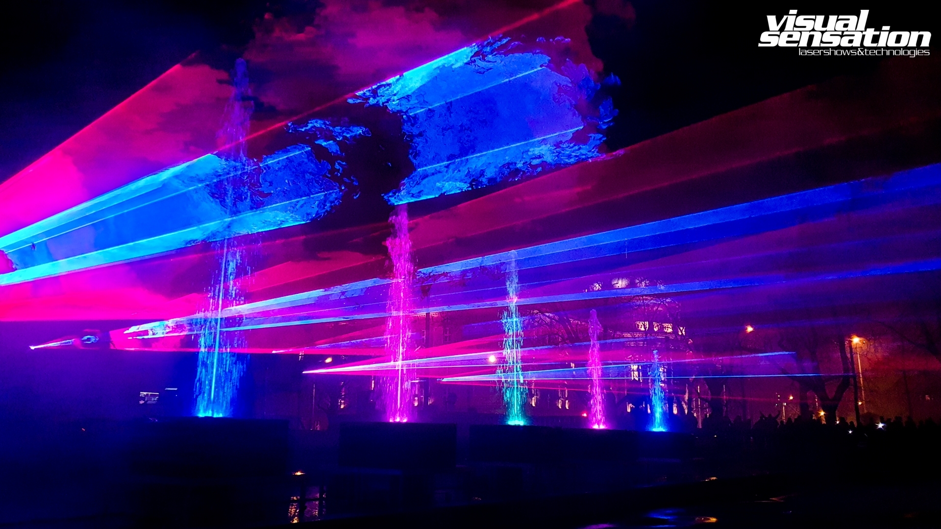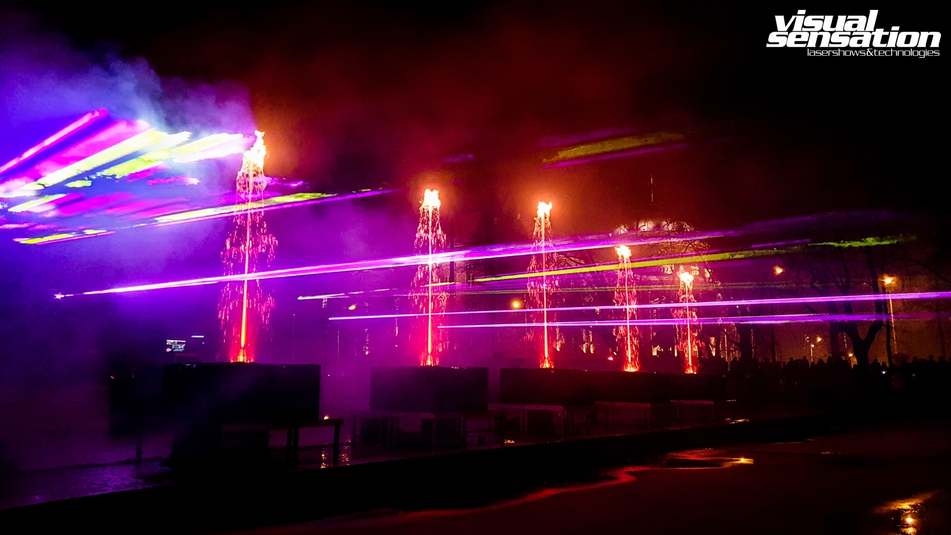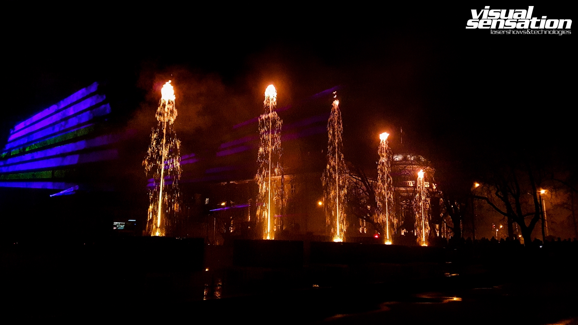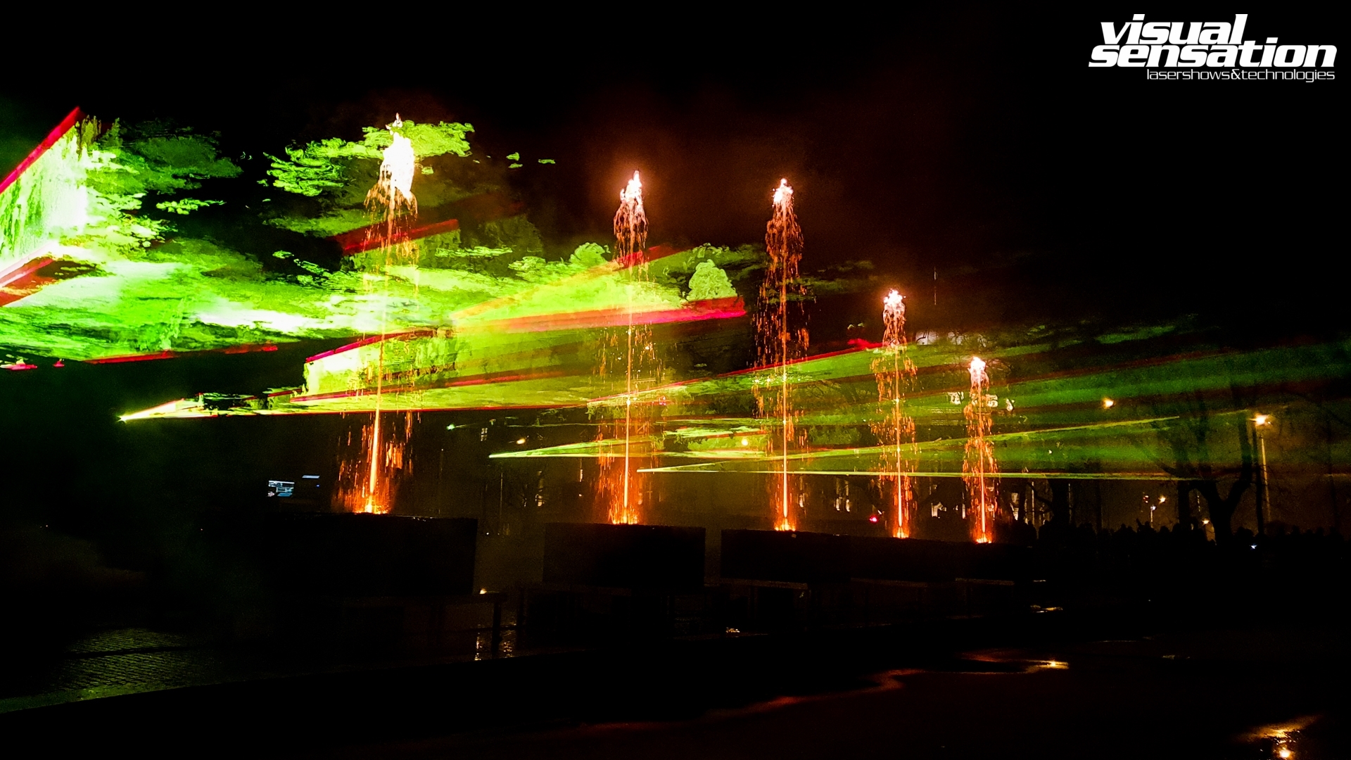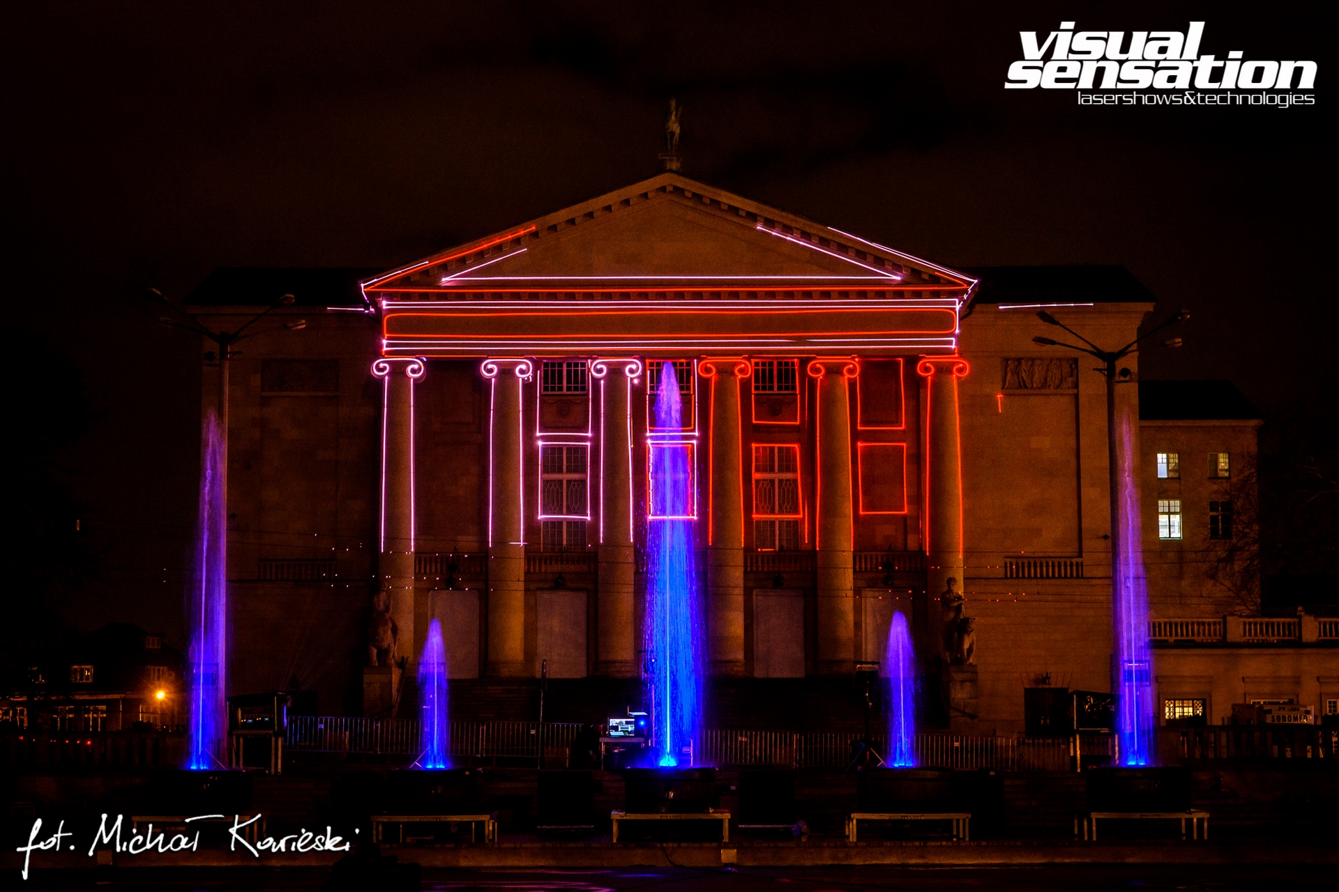 Pokaz laserowy z wykorzystaniem fontann wodnych z płonących żywym ogniem podczas Festival of Lights Poznań – W hołdzie Powstańcom.